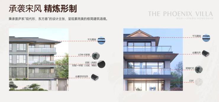 在用材方面以深灰色铝板批檐、深色铝板、瓦屋面、深灰色金属线条、仿木纹铝格栅、仿木纹金属线条为主,整体营造轻盈质感。