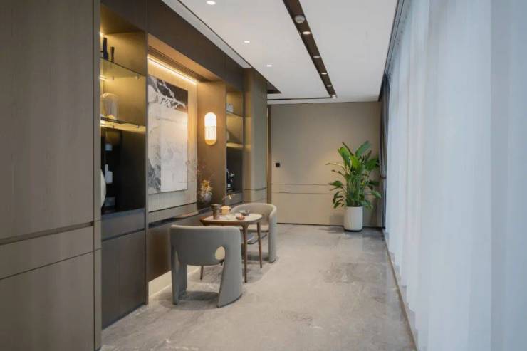 在江澜云境阁的约350m²,于北向大厅和南向3个房间之间,也有约8米长、3米宽的过厅,一侧做了柜架、茶台,另一侧是整排全落地玻璃。