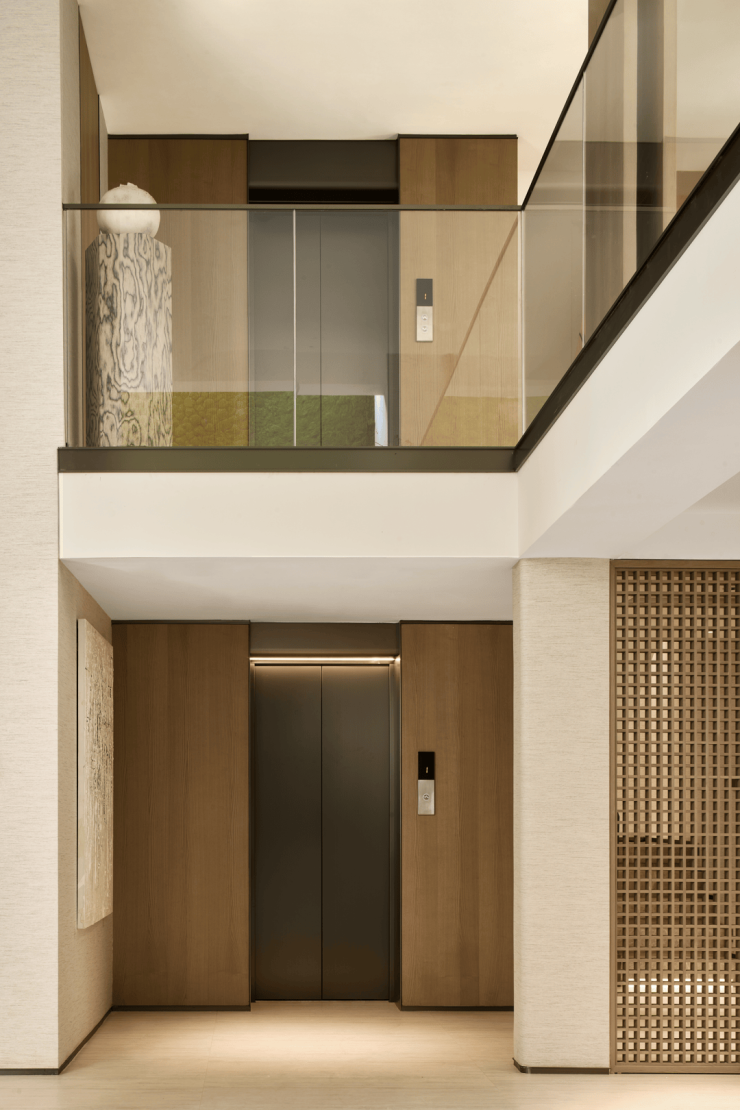建筑坡顶采用大坡顶与小坡顶结合,屋面采用瓦片材质与金属钩边进行铺装,青瓦交叠,如远山淡墨。立面局部采用仿石铝板进行装点,在檐下空间与建筑装饰上,点缀了橡木灰金属材质,形成克制且奢华的冲突美。