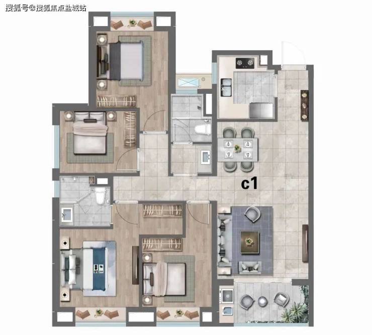 其中,建面约104㎡三房两厅两卫 ,三开间朝南+全卧室带飘窗+动静分离+南北通透+主卧套房设计,功能性和空间感完美结合,采光面非常足。