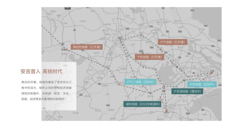 【交通信息】:交通处于长三角生活旅游圈,上海走G50转杭长高速2小时左右,下高速10分钟到达项目,沪苏湖高铁40分钟直达上海虹桥,杭州丶杭长高速70分钟。