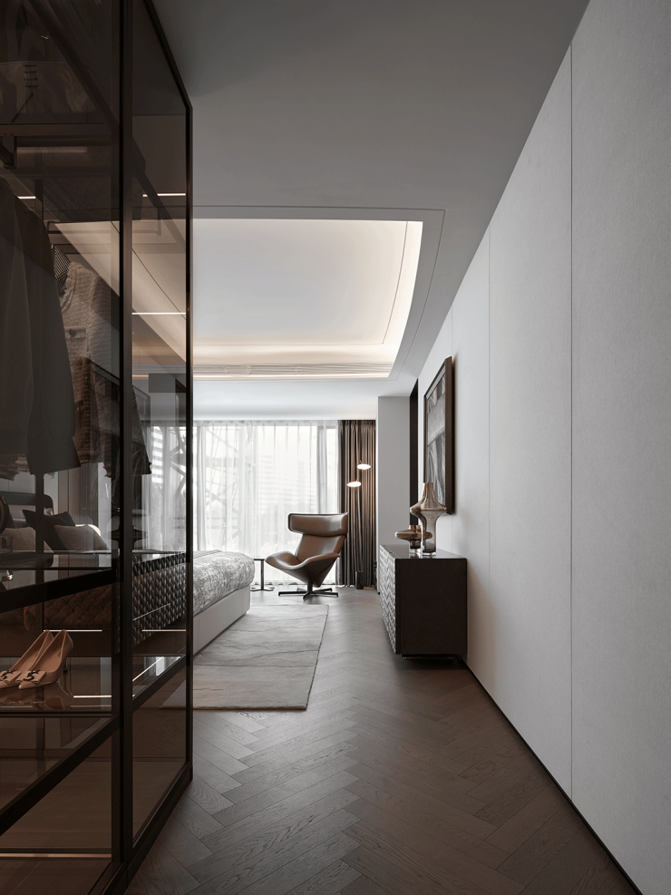 从主卧延伸至主卫的步入式衣柜,给予空间更强烈的结构感,对设计美学和功能主义的揉杂进行重新诠释,也将精致生活的幸福主旨排列而开。深色玻璃和金属边条的搭配,给予一丝神秘,透露出隐逸内敛的调性。