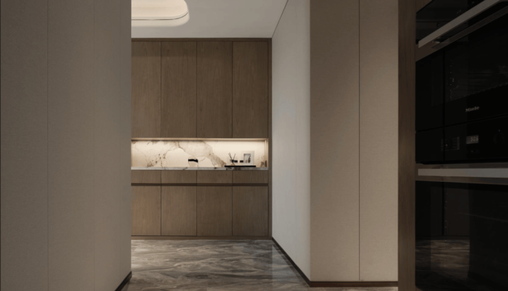 白色的岩板与桃木背景墙让人联想到枫丹白露宫殿的动人秋天。打造生活中的高级感不需要繁琐复杂的浮夸装饰,而是要在空间之内做减法。深色与浅色的交叠呼应之间,让曲线与直线共同构建空间的秩序,匹配房间整体弧形外观,打造内部张弛有度、流畅自如的线条感。