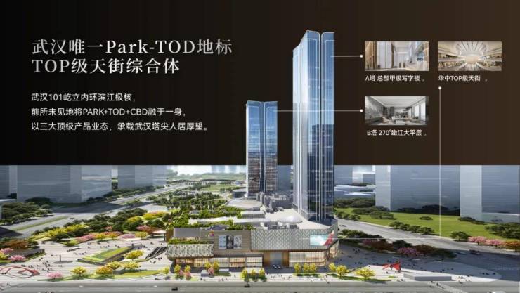 武汉101,屹立内环滨江极核,前所未见地将PARK+TOD+CBD融于一身,产品涵盖A塔甲A级总部地标、B塔270°瞰江大平及华中TOP级天街,以三大顶级产品业态承载武汉塔尖人居厚望。