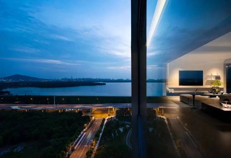 客厅的设计通过无缝落地玻璃窗将窗外的山景引入室内,空间体验开阔而通透。日间高性能的玻璃窗引入了大量的自然光线,开放式的空间布局增强了空间的流动性和互动性,夜间通过嵌入式LED灯带、壁灯和局部照明,营造出不同的光影效果和氛围。