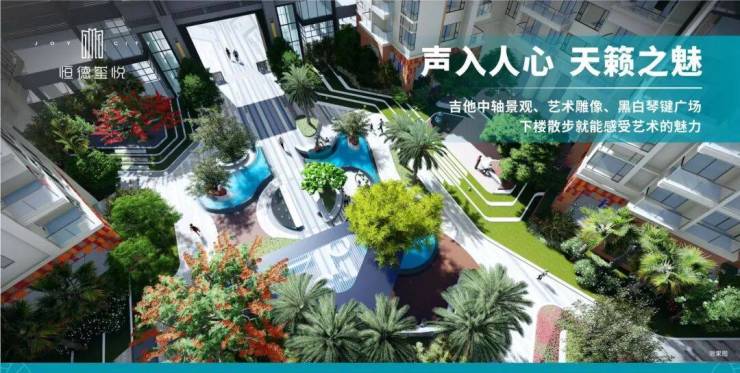 7、天籁之魅 音乐园林灵感源自吉他小镇,吉他景观中轴、黑白琴键广场、艺术雕塑,处处有惊喜。独特创新,定制化地面铺装,只为还原生活的玺悦。