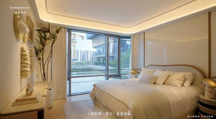 南向三个卧室,主卧配置一整片广角落地窗,约270°的弧形设计像把天空和园林剪下一块。