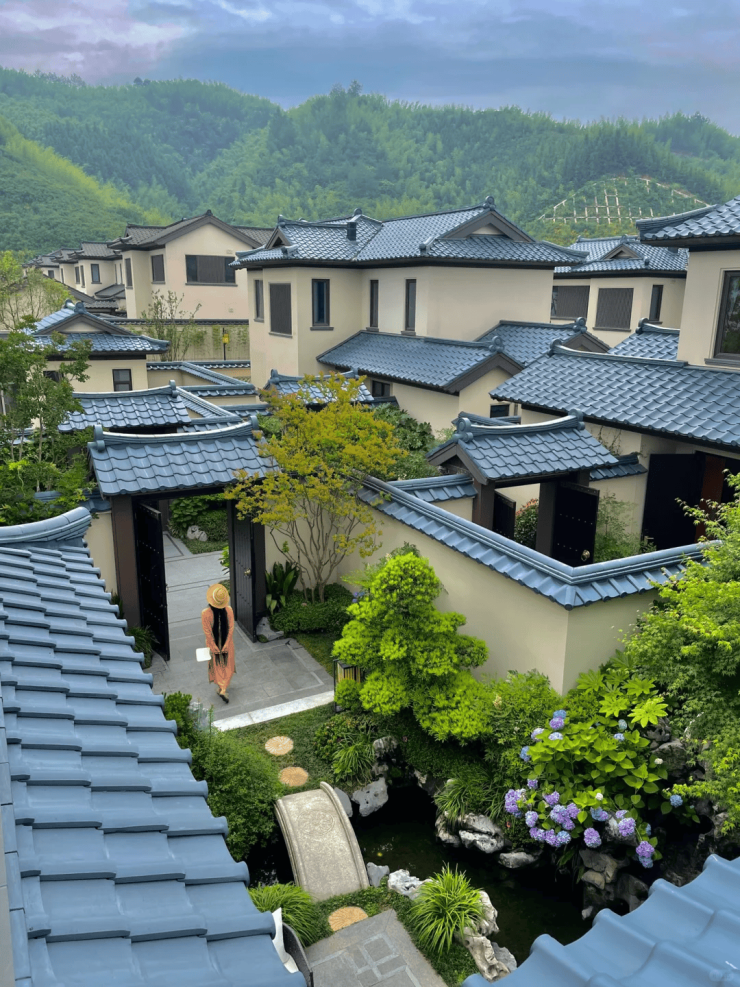 设计理念:以唐风为骨、山水为魂,遵循天目山山脉肌理,传承中国传统造园之法。采用围合、里坊、街巷等布局,飞檐翘角、白墙黛瓦,展现中式美学。