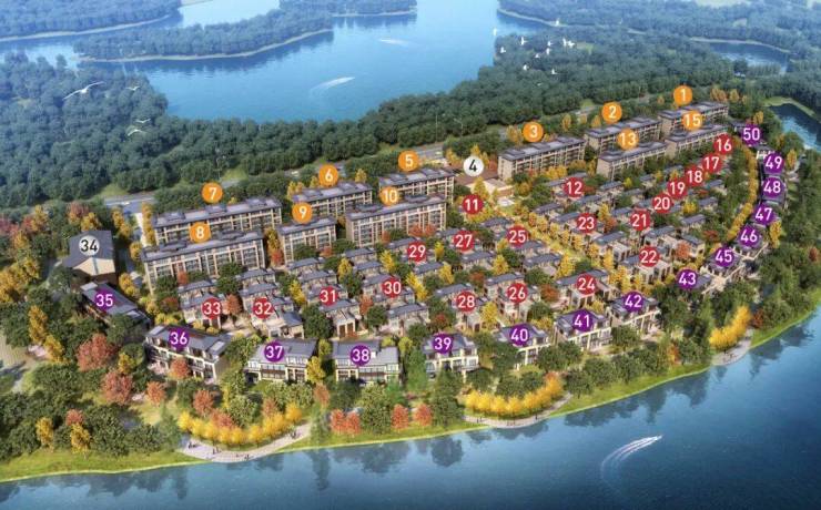|产品类型:洋房(黄色标签),合院(红色标签),临湖别墅(紫色标签)