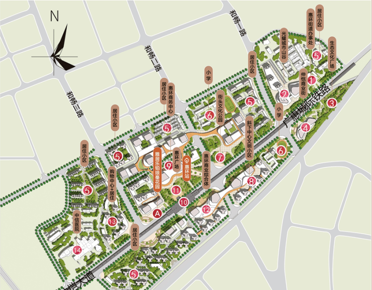 惠环行政商贸区位于规划区的东部,是仲恺高新区的东门户入口,是以城际轻轨站惠环站为核心的TOD商业服务区。以城际经轨站为磁心,以现代商业为强引力,核聚惠莞深三城财富、人气、资源,打造以轨道交通引领的仲恺东部门户新客厅,升级行政商务中心,未来前景不可估量!