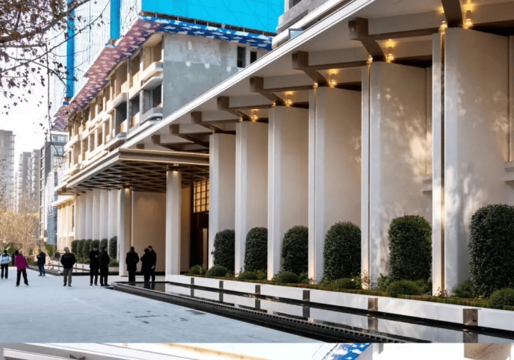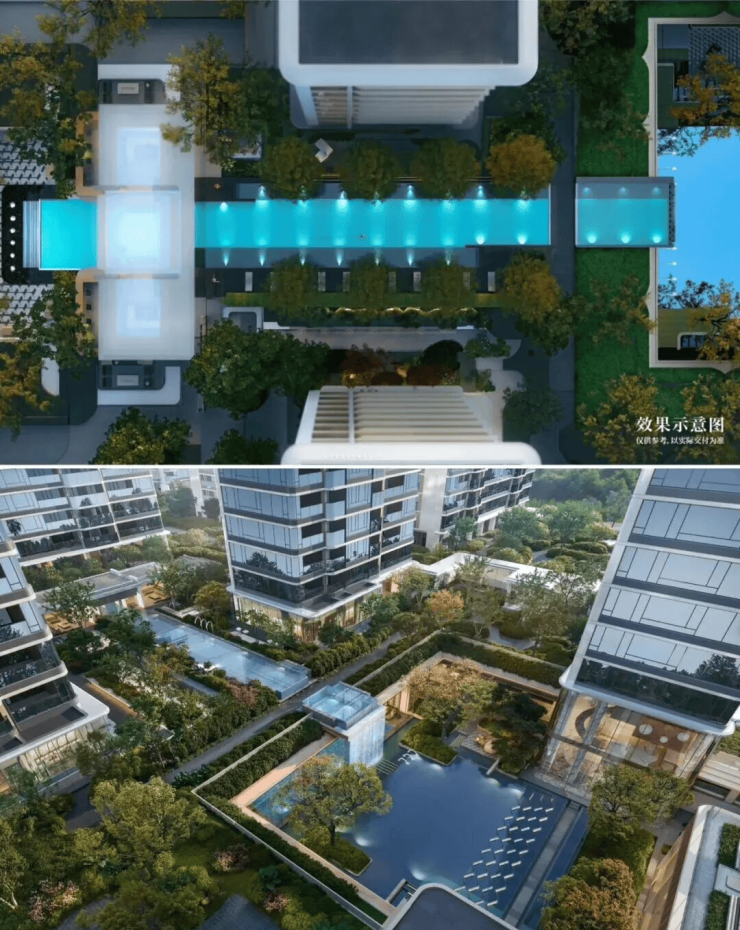 小区中央打造的是一个超长的网红水池,有点像三亚柏悦酒店的泳池,水池端头还设置了水幕瀑布,落到下沉庭院的大面水池中,形成联动与呼应。