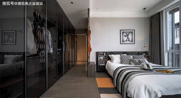 长辈房的布局并不落俗套,以床背板为弱隔断,划分出了睡眠空间和衣帽空间。面朝明亮的落地玻璃,天朗气清的格调让室内氛围更显松弛。床背板后的书桌兼顾妆台的功能,一人伏案,两人陪伴的共享空间,让卧室格局更显浓厚亲情。