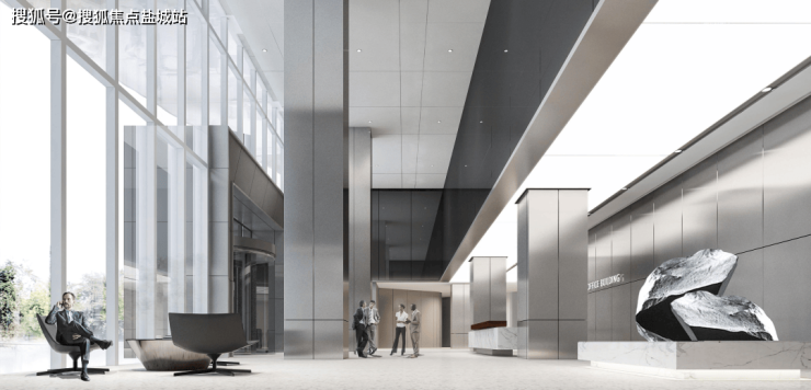 入户大堂以“城市会客厅”为设计理念,打造出具有艺术质感的商务空间。