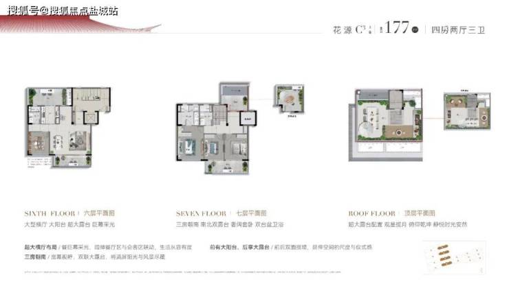 比如建面约170㎡的双层下叠四房两厅三卫,约9.7米面宽,三开间朝南的大四房格局。约6.9米面宽,两房朝南;南向房间一字拉平,北向也设置房间,但确保每一层空间,与院落、阳台或露台衔接,迎接漫天漫地的阳光与月光。