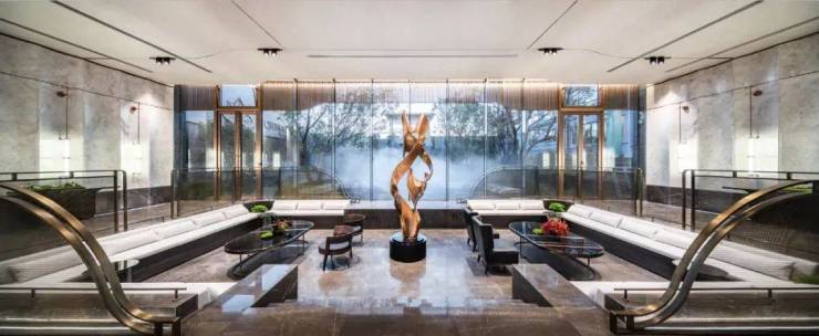 归家大堂内部,参考安缦酒店、虹夕诺雅的顶奢风格,大量石材上墙、铺地,营造星级酒店般的归家氛围,让业主每次归家都保持度假般的愉悦心情。