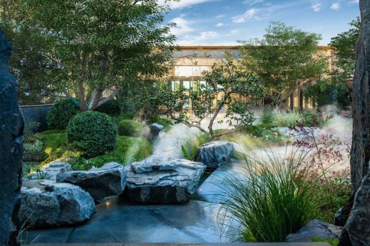 项目特邀享誉业界的顶尖设计团队执笔园林景观设计,利用架空层带来的地势高差,打造出约6米高的假山,一座中式凉亭置于假山之上,流水沿亭顶倾泻而下,随即流入山前水潭之中。