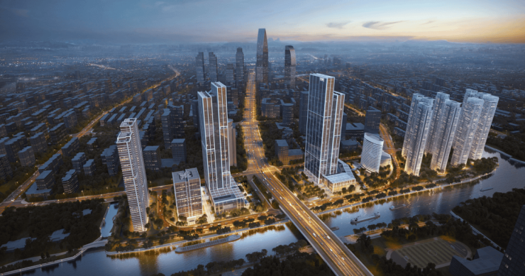 龙湖·山河颂位于江苏省苏州市高新区塔园路181号龙湖狮山天街F1,坐拥狮山核心区域,紧邻京杭大运河。项目规划了两栋200米以上的超高层地标建筑,以及两栋150米的住宅楼和一栋公寓楼,五栋建筑沿运河西岸由北向南排列,形成了长三角地区首屈一指的豪宅地标建筑群。这些建筑不仅在设计上独具匠心,更在视野上达到了极致,让每一位业主都能享受到“一览众山小”的壮阔景象。