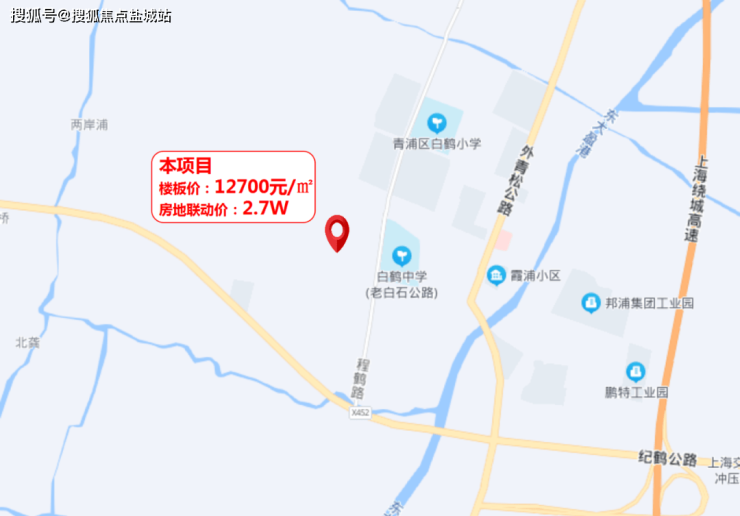 2021年6月21日,宝业集团以总价5.69亿元竞得青浦区白鹤镇白石路北侧30A-01A地块,成交楼面价12743元/平,溢价率8%,房地联动价2.7万/m²。