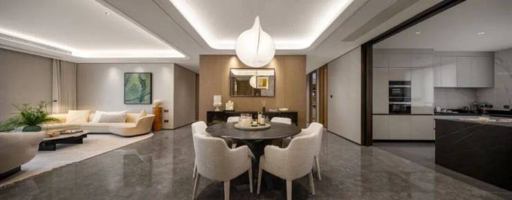 精心设计的灯光与水磨石地面,将功能性空间转化为具有五星级酒店仪式感的隐奢第一厅 ,让每一次回家都成为从喧嚣步入宁静的转换。