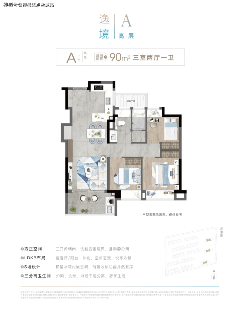 建面约90㎡三房户型,三开间朝南,动静分离设计,彰显优越的空间感;三段式卫生间布局,洗漱区、淋浴区、如厕区各自独立,互不干扰。建面约100㎡户型,三房两卫动静分离格局,餐厅、客厅、厨房、阳台LDKB一体化贯通中轴场域,大气敞亮;全卧均带飘窗,空间感和尺度感满分;主卧套房贯穿南北,衣帽间+独立卫浴层层递进,大气又兼具私密性。