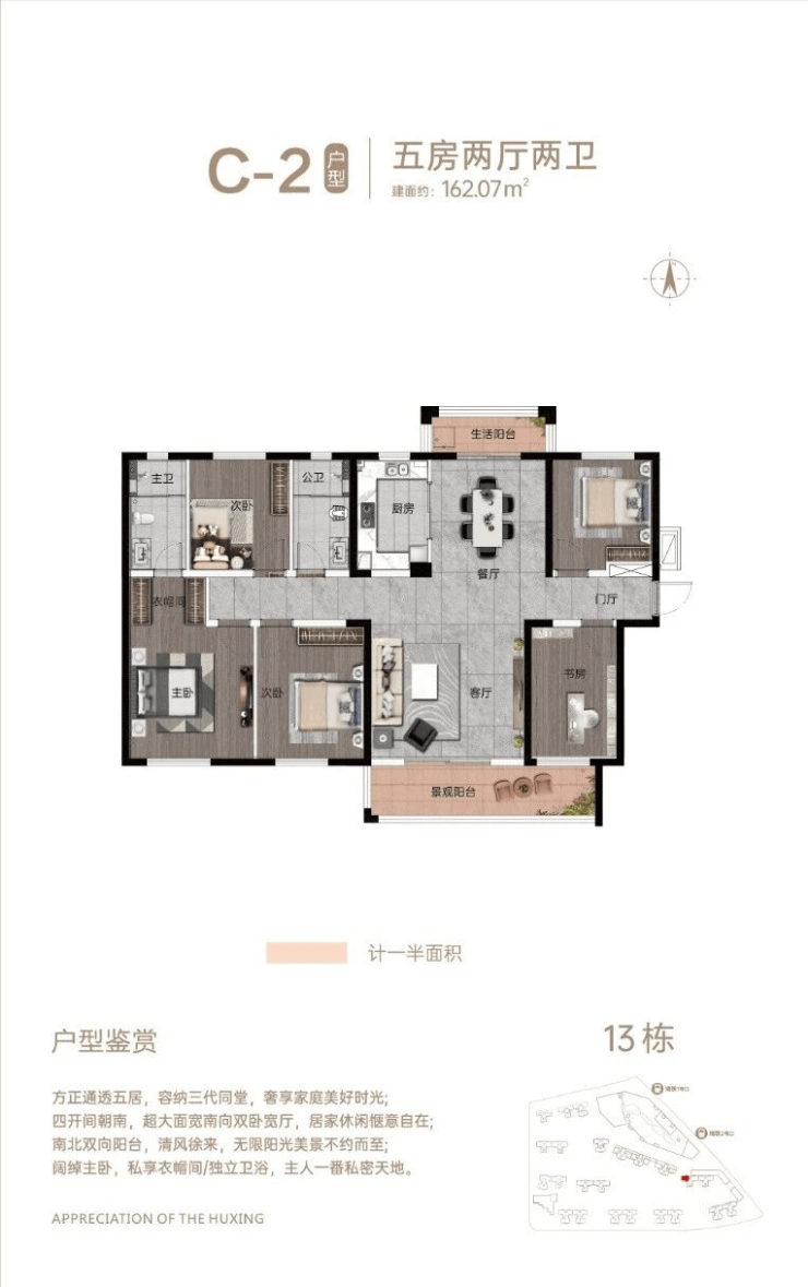 户型:建筑面积约109-162平方米,涵盖三房至五房,户型设计注重空间利用率,部分户型带景观阳台。