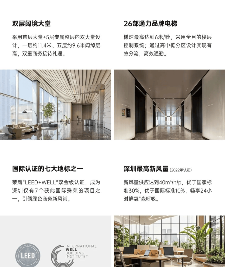 ✨绿色商务:LEED + WELL 双金级认证、悦享深圳最高新风量、约𝟑𝟕𝟎𝟎㎡空中花园