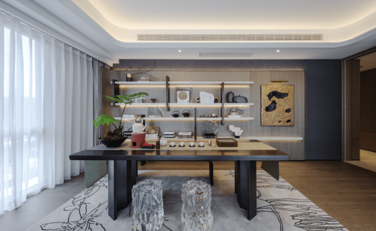 各处柔和的弧线让视觉得意舒缓,弧形书桌、屏风和书架的倒角,似乎都在消弭着思绪的固执和冷冽,它们吸收了一切,也成全了心与空间的交际。