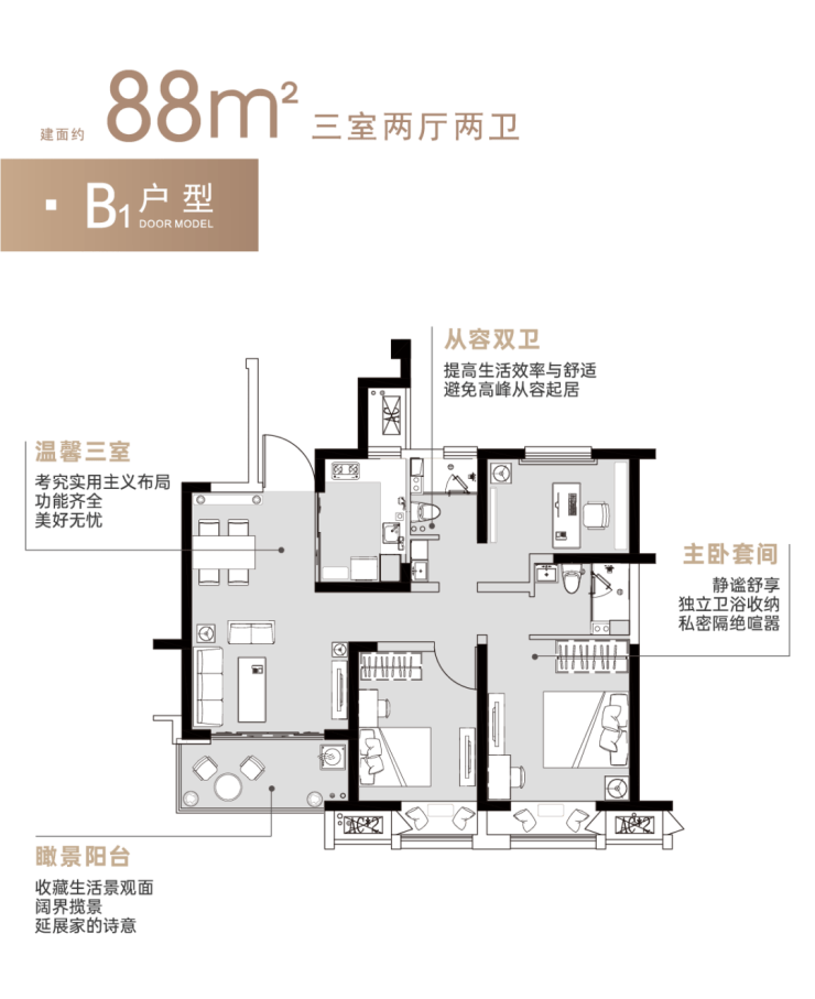 建筑,不止是家的容器,更是历经时间淬炼,一处心灵的栖息地,在精雕细琢的考量下,成全内心的每一份向往。建筑面积约88m²B1菁望,在有限的空间内,做到了三室两厅两卫的布局,为品质生活呈现不一样的舒适感。陆家建滔菁庭预约热线:400-000-5503转9999✔✔