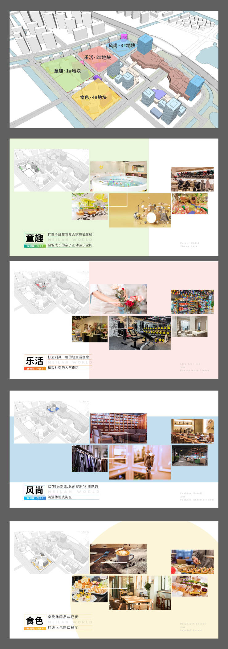 (3)特色铺:在产品定位阶段,便将四个地块商铺规划为童趣、乐活、风尚、食色四大主题。