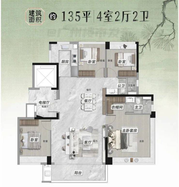 主阳台长度5.3米,主卧带主套并配有270度观景飘窗,门口赠送的电梯间每一户都有。