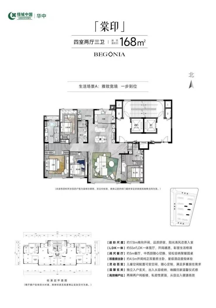 每一户精心打造,尊享宽敞的LDK大客厅与双主卧套房,如168平米户型,客厅空间扩展至约55平方米,营造出舒适宽敞的生活尺度。同时,配备约4.5米开间的双主卧套房,尽显主人尊贵气质。更值得一提的是,在未计入电梯厅等公共区域面积的情况下,168平米户型的实际得房率高达100%,最大化实现空间价值与利用效率。