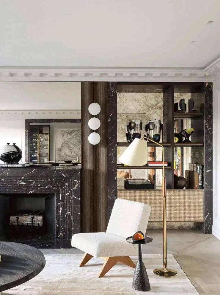 餐客厅尺度达到了惊人的16米,97m²,用一席壁炉做了视线分离,米色的洞石、自然冰裂纹的艺术漆。背景墙拱形胡桃木的静谧,地板拼花木格纹的精细,沙发钢琴键织布的韵律,营造的是回归生活本质的轻松写意。