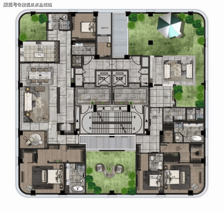 二楼带景观露台,顶楼空间则奢侈到夸张,490m²五房,一层一户送三个露台,比传统的300m²地上三层地下二层的别墅还舒服。因为别墅单层面积80m²,吃个饭楼上楼下跑,这里则是490m²摊在一个平面,因此这类顶楼大平层极度稀缺