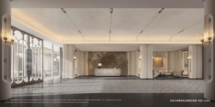 从步入社区大门开始,约70米超大尺度门庭、奢华酒店般的港湾式落客,就将仪式感便顶格拉满;星级酒店大堂,内部多处装置融合非遗技艺美学,生活在尊贵与艺术之间巧妙平衡;进入下沉式中庭花园,归家路上移步异景;单元入户入口延续奢华酒店质感,采用奢石与铝板叠加的奢华设计,碰撞法式圆润线条,仿佛艺术殿堂。