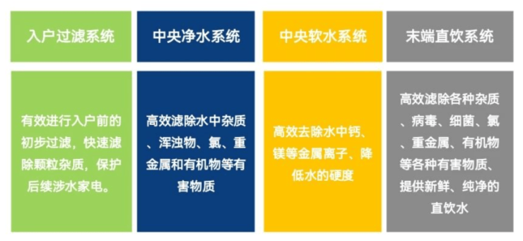 四重净软水系统:怡口入户过滤+滨特尔中央净水+怡口末端直饮+滨特尔中央软水,通过三重精密净水层层过滤,结合中央软水系统,实现24小时全屋净水软水覆盖