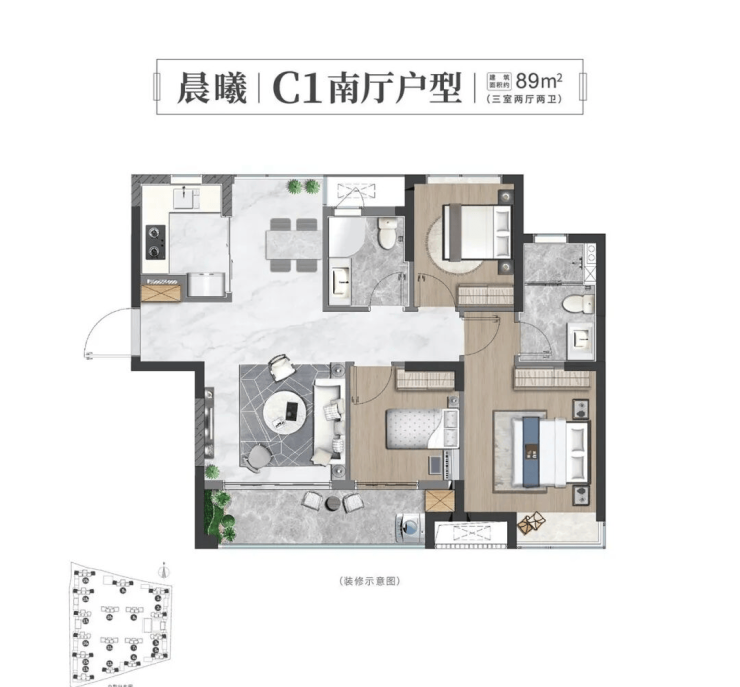 - 【晨曦3房89㎡南厅】 三房两厅两卫