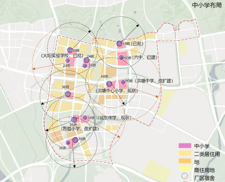同翔高新城规划建设24所学校,平均半径约800米一所学校,涵盖幼儿园、小学、初中、高中全龄段教育,满足约15万人口的就学需求。
