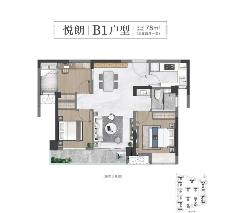 - 【悦朗3房 78㎡】 三房两厅一卫
