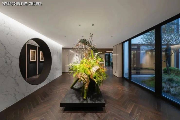 餐厅与客厅通过长长的、金属 动态处理 的现代木质茶桌相连。 同时,这张茶桌连接的也是传统的生活意趣和现代的生活习惯: 依旧品茶,未必要用旧桩陈盏; 仍然插花,并非囿于梅兰竹菊。