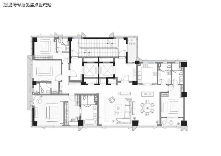 横向L型走廊,开阔洄游动线模糊界限,放大空间的优势拓宽视觉感受,同时,LDK一体化全家庭社交厅,动静分区、南北通透、岛台设置……空间以相互交错的平面圆弧为层次结构,在互动间让心灵情感升温,带来全维感官享受上的跃升。