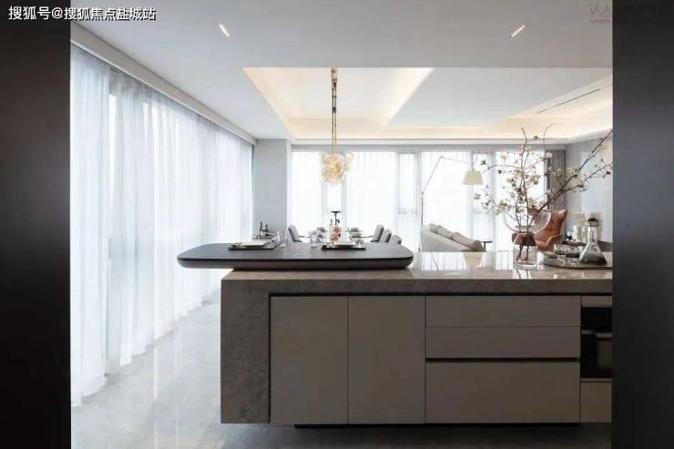 厨房、吧台和客餐厅构成家庭互动活动的沙龙区。近8米面宽的明亮区域,让家人们共聚一堂也绰绰有余~
