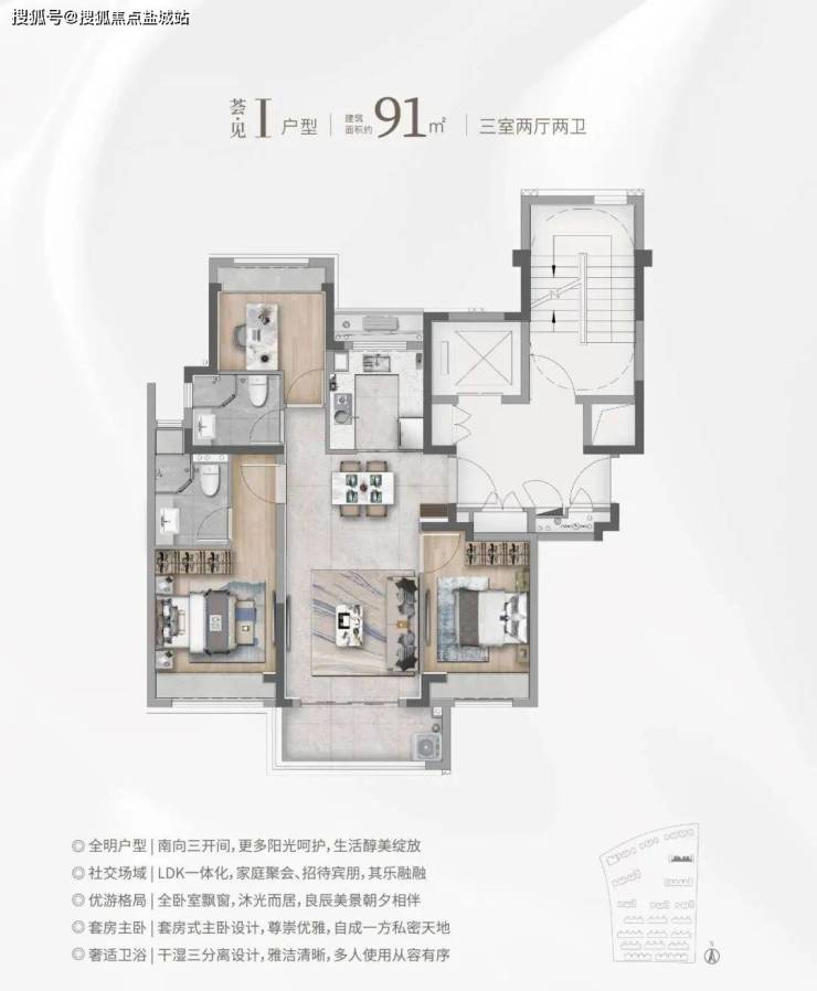 市面上90㎡左右户型两房居多,华发海上都荟建面约91㎡直接3房一步到位,并且有2卫配置,主卧进阶套房,功能性远超同价位竞品!