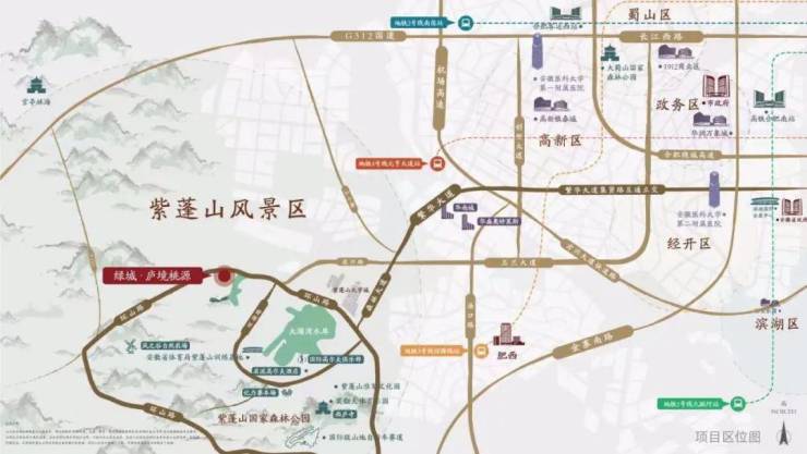 四、恰到好处的城市距离,同频主城发展,繁华大道一脉通达,西接环山路直抵项目,离尘不离城,境合山水自然,令人向往的合肥城市后花园。