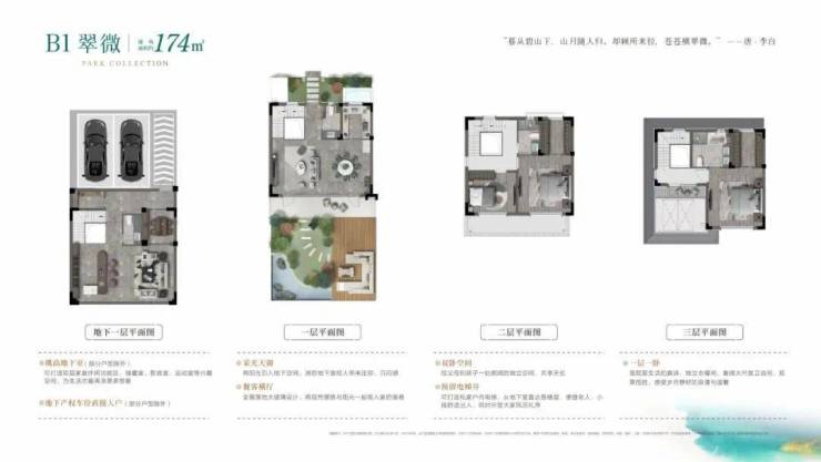 • 174㎡雅致四院:前庭后院双院落设计,6.8米横厅连接观景露台,主卧套房配备全景落地窗与独立衣帽间;