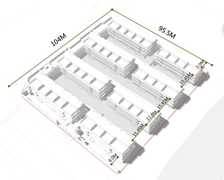 设计伊始,如何解决中式有序的社区空间形态与大容积率的矛盾成为重中之重。通过解题场地及周边信息,在南北进深约104米的场地上,精确研发产品的进深,控制到11.8米,能够布置4排多层,运用好南北向的间距,不浪费每一寸土地,同时还给业主最大的前后场空间保证最佳的居住品质。