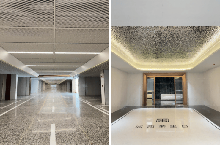 »精装艺术车库:按照长沙顶豪标准,打造精装车库,高档水磨石地面,铝拉网+铝方通艺术吊顶,墙柱采用特级岩板,归家仪式感。