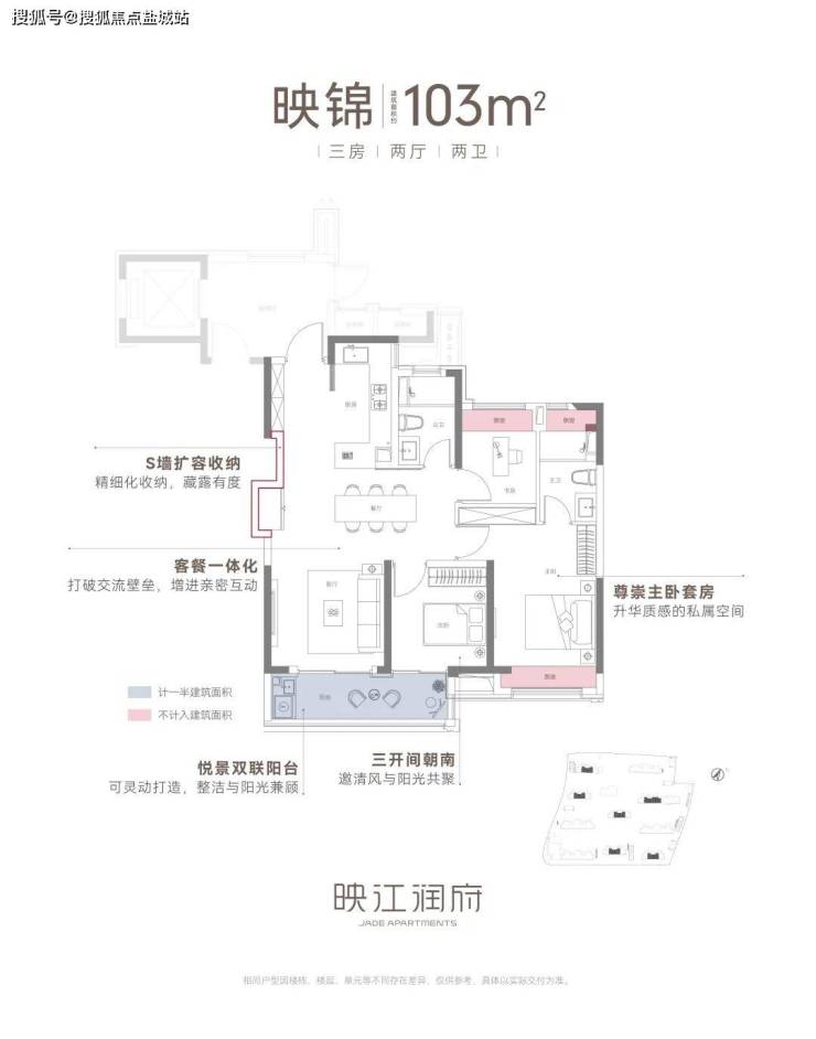 建筑面积约103㎡三房两厅两卫,不失为改善家庭的首选。其中边套户型,映江润府的主卧套房做了 270°环幕飘窗,实现无与伦比的采光通风和视野享受,类比于千万级豪宅的体验!
