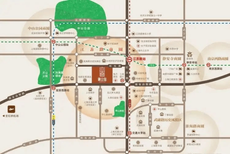 交通配套:2/11号线江苏路站,2号线乘坐2号线1站可达中山公园。