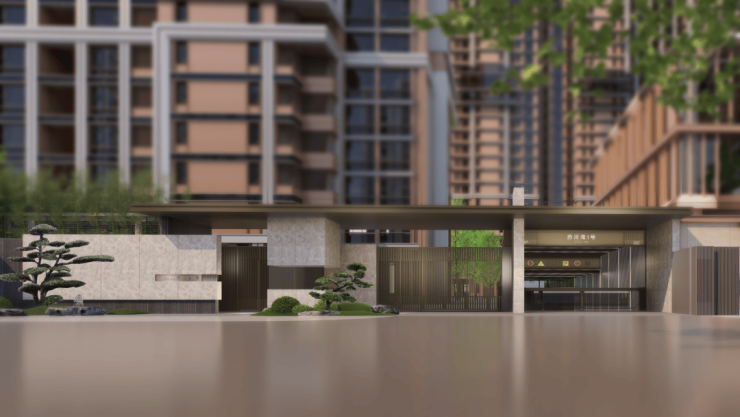 项目的大门归心庭采用云朵拉灰+铝板+铝格栅的搭配,低调又大气;