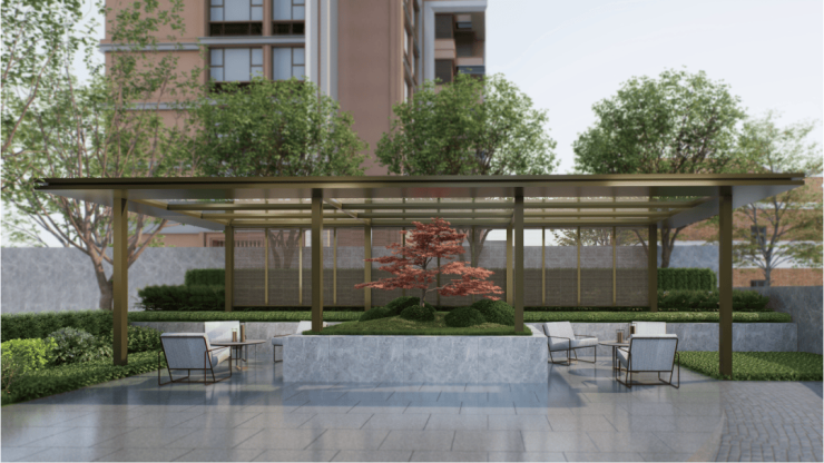花间茶舍由铝板、玻璃顶以及金属帘,外加局部镂空的设计共同组成;